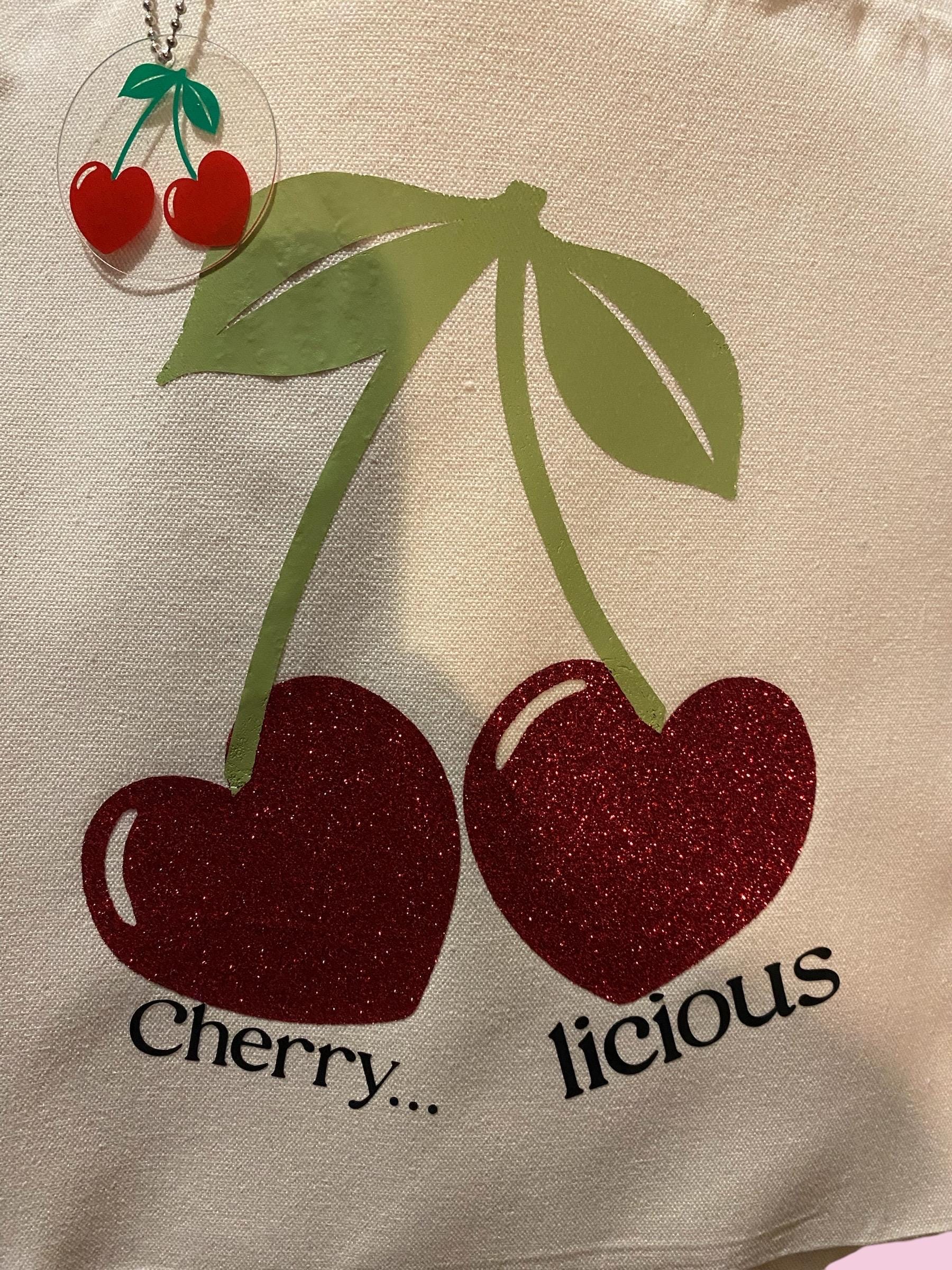 Brighten up your shopping trips with this adorable hand-decorated glitter cherry tote bag! Featuring vibrant glitter cherries and the fun 'Cherry-Licious' phrase, this eco-friendly reusable bag is both practical and stylish. Plus, it comes with a matching cherry keyring for extra charm!