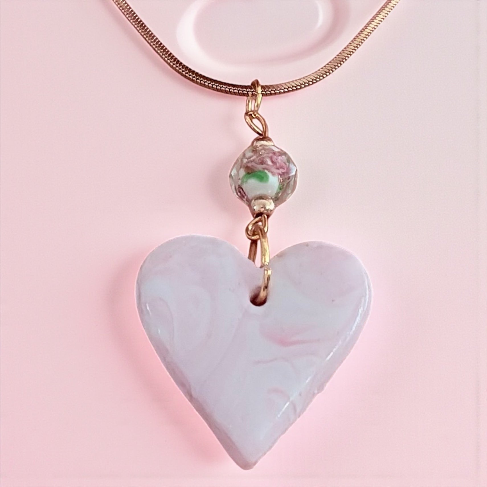 Pink Heart Necklace - Handmade Clay Pendant with Flower Bead & Gold Chain