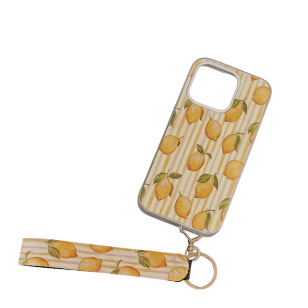 Brighten up your day with this adorable lemon patterned phone case complete with a matching wrist chain! Featuring a cheerful watercolour lemon print on soft yellow stripes, this accessory duo brings fresh, summery charm to your everyday essentials.