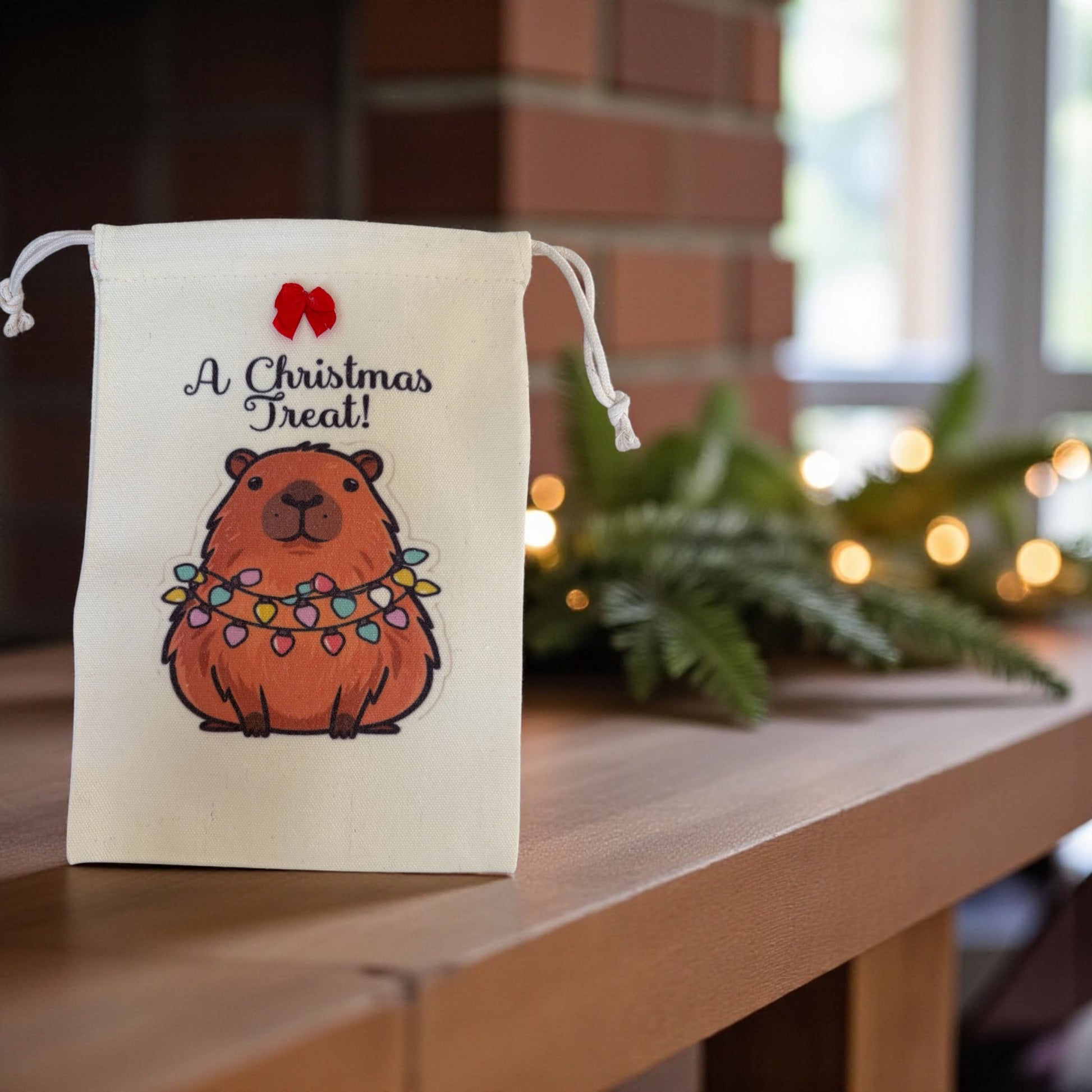 Perfect for filling with sweets, chocolates, small gifts, or festive treats, this delightful bag can be customised with a name or message to create a truly unique present. The festive Capybara design adds a handmade touch to your Christmas gifting.